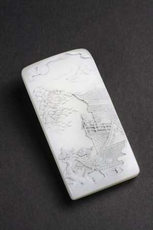 2008年,余勇創作的白玉《山水牌》在多項玉雕評比中屢獲佳績,其創新手法也引起了業界的關注和認同。作品運用中國水墨畫的表現方式,采用淺浮雕法,構圖巧妙,層次清晰,意境悠遠,洋溢著濃厚的儒雅氣息。