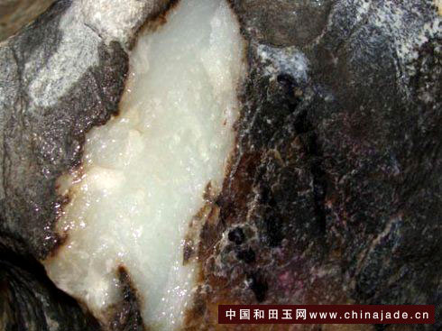 灰皮料的“灰”是指其外表皮像灰狀,呈白色土塊光澤,表面不緊固,呈松散狀。灰皮料為棱角狀,表面有平直裂隙,整體為白色石灰狀皮殼包裹,白色石灰狀皮殼厚約1~10mm不等,皮殼下是灰黑色、紅褐色玉質,玉質一般厚數毫米,其內部則為白玉、青白玉質。