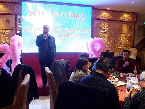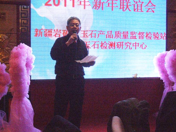 新疆巖礦寶玉石產(chǎn)品質(zhì)檢站常務(wù)副站長(zhǎng)岳蘊(yùn)輝在新年聯(lián)誼會(huì)上總結(jié)了2010年質(zhì)檢站的工作,感謝寶玉石行業(yè)客戶對(duì)質(zhì)檢站工作的大力支持。質(zhì)檢站將繼續(xù)秉承質(zhì)量第一、優(yōu)質(zhì)服務(wù)、科學(xué)公正的宗旨,一如既往的為廣大新、老客戶服務(wù),與大家一起創(chuàng)造新疆珠寶首飾行業(yè)的新輝煌。