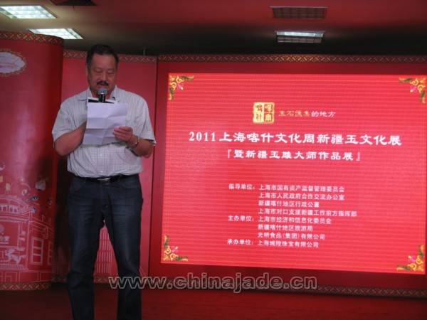 本次活動(dòng)的開幕式上,馬進(jìn)貴大師代表新疆寶玉石協(xié)會(huì)、新疆工藝美術(shù)協(xié)會(huì)發(fā)表了熱情洋溢的講話,他說:“作為上海援疆工作的重要組成部分,“2011上海喀什文化周新疆玉文化展”的舉辦,為我們新疆的工藝美術(shù)大師、玉雕大師提供了一個(gè)展示才藝的舞臺(tái)。同時(shí)也為推廣和弘揚(yáng)中國(guó)玉文化起到了積極的推動(dòng)和促進(jìn)作用。