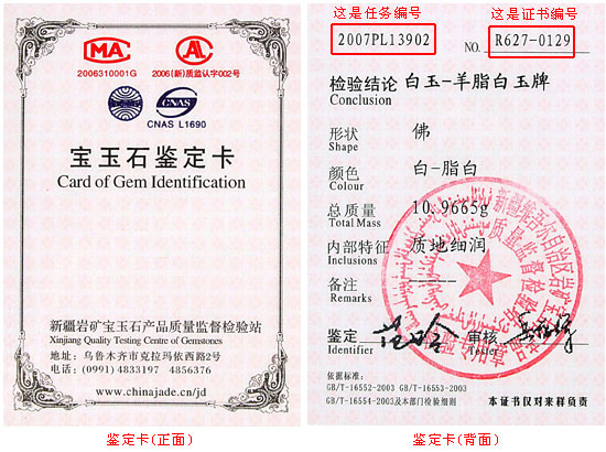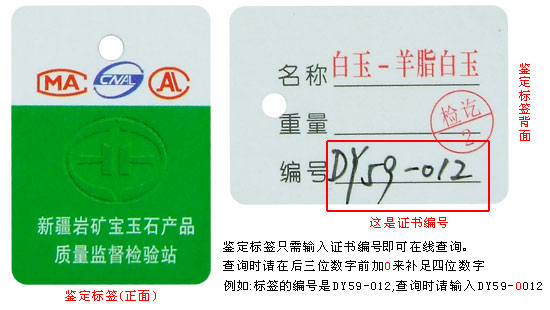 四、鑒定標簽,產品經過鑒定的標志,有產品鑒定名稱、重量和鑒定編號。