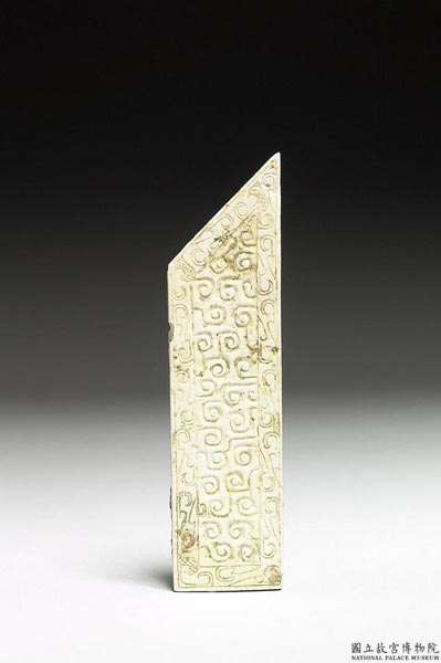 玉璋盛行于夏和商代。西周的玉璋極為少見,其器身窄長,尺寸較小。中略內(nèi)凹,三角形端刃一尖長,一尖短,長方柄,扉牙之間飾以平行陰線。春秋玉璋形狀較多,或呈扁平條形,素面無紋;或端刃內(nèi)此作弧形;或首端呈斜角;或上、下端皆微作斜角,身兩側(cè)一邊微弧,一邊似斜刃。戰(zhàn)國以后,出土玉璋幾乎不見。