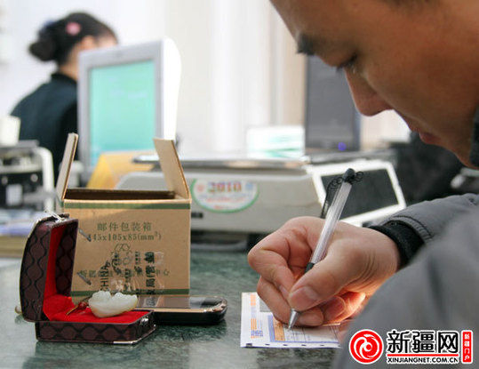 新疆網訊(記者 高婷報道)2月6日,在烏魯木齊西虹東路附近一家郵局內,前臺上擺著一個紅色小盒子,里面裝著一塊和田玉,它的主人劉堂正在一旁填寫快遞單,他一邊寫一邊拿著手機看微博核對郵寄地址,包裝、稱重、粘貼、簽字,跟貴州女孩的交換物終于寄出。