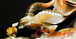 去過該館的讀者也許能記得這個獸首瑪瑙杯巧奪天工的制造技藝。玉師在玉材的小端雕琢出惟妙惟肖的獸頭,把紋理豎直的粗端雕琢成杯口,而口沿外又恰好有兩條圓凸弦,線條流暢自然,天衣無縫。作者巧妙用俏色技巧,將獸眼刻畫得黑白分明,形神畢肖,真正達到“畫龍點睛”的效果。兩只角粗壯有力,顯示著強烈的動態美,兩耳高高豎起,微微內收,仿佛聆聽世間的聲音,整個杯的造型與動態,描述了全神貫注飛馳疾奔的猛獸向前突沖的一瞬間,令人心動。