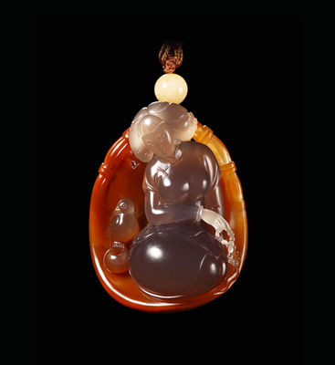 由瑪瑙俏色巧雕的“金屋藏嬌”把件則獨具創意,作品順色立意,依勢造型,俏色天成,讓我們充分領略到了瑪瑙色彩的獨特魅力和工藝的巧奪天工。