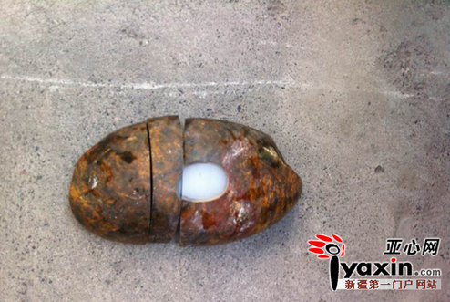 玉商們把羅青切成三塊的“玉石”拼接起來看,其重約2公斤、長約20多厘米,兩頭稍尖,中間是直徑約十多厘米的一個相對規矩的“玉石”,石頭中間部位是按業內習慣開的橢圓形天窗,其露出的玉質,看上去細膩、潔白如脂。