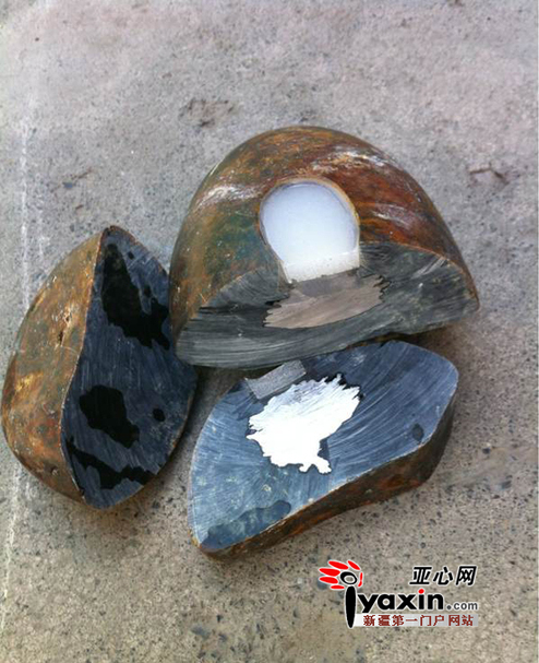 第一刀切開,黑青黑青的兩個整面都是僵石!第二刀切開,天窗露出的淺淺一層“白色玉石”下竟藏著塊拳頭大小的鉛!日前,花了數千元買的一塊“玉石籽料”切開后,讓在新疆烏魯木齊市南門附近開了多年玉器店的玉商羅青愣了半天。