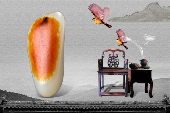 4、由于近兩年在和田干(古)河床中挖出了一部分經長期風化過的外表帶淡白漿的原籽玉,為了美觀,玉石商人就對其進行加色處理,并逐漸蔓延開來,以至現在許多原料在出售之前都被先來一個二上色。而有些專門造假的商人借助此種趨勢,大批量通過深度、全面對磨光料進行燒色、加彩進行假和田籽玉仿造,使很多人上當受騙,損失賠本。