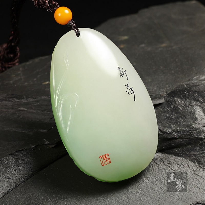 該掛件精選翠青白玉精琢而成。玉質瑩潤光潔,翠色飽滿,無瑕疵。風過荷塘,滿池碧蓮搖曳,滴滴荷露清圓如珠,漣漪層層漾起。小荷尖尖初綻,引蜻蜓流連,似與低語 。整件作品情景相生,動靜得宜,可謂靈氣十足,堪為精品。為江蘇玉石雕刻大師殷小金之作。