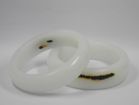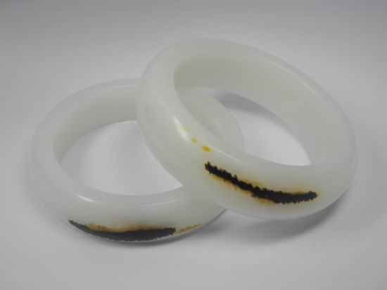 青海、俄羅斯白玉中,偶然可見白色或黑皮料。盡管新疆仔料也有些皮子顏色較深,但黑皮料,被認為是青海料和俄料區分于和田料的特征之一。近日,筆者遇見一對可達到“羊脂玉”級別的“黑皮”白玉手鐲,遺憾的是,經過檢測,“黑皮”是人工充填制作的。
