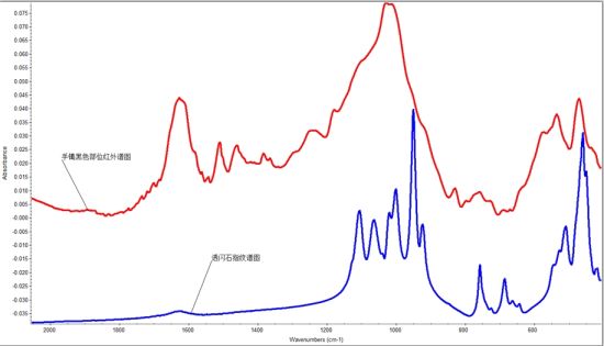 圖4、手鐲白色部位(藍線)與黑色部位(紅線)的紅外吸收光譜對比圖