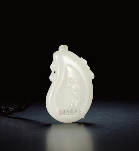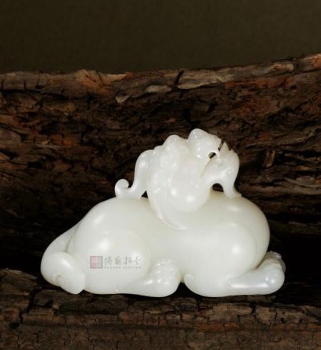 由和田玉籽料立體雕而成,玉質細膩滋養,白度亦佳,局部留玉皮,以證和田玉籽料之出身。辟邪昂首坐立,頗具氣勢與力度。辟邪首雕刻尤為精致,繁簡之間與光滑細潤的身體形成了對比,既可欣賞工之精,又可把玩玉質之妙,是本場中較為重要的拍品之一。