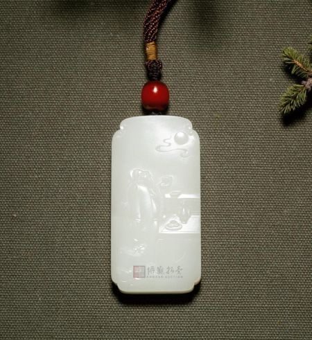 新疆和田玉籽料,質地溫潤。牌型四方倭角,工整大氣。畫面展示了李白舉杯暢飲邀明月的場景,畫面感強烈,寫實刻畫,一輪明月懸掛天際,增強了作品的空間感;作品背面,印刻竹枝,上下運用變形龍首紋勾勒,規整有序。