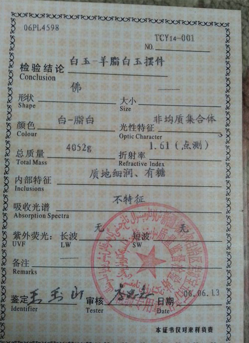被盜玉器質(zhì)檢證書