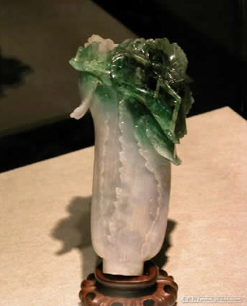 這株翡翠玉白菜以一塊半白半綠的翡翠為原材料,因材施以巧雕工藝,將綠色部分雕成菜葉,白色部分雕成菜幫,形態喜人,鮮活欲滴。翠色部位巧雕了兩只昆蟲,一為蝗蟲,一為螽(音終)斯即通常所謂的蟈蟈。
