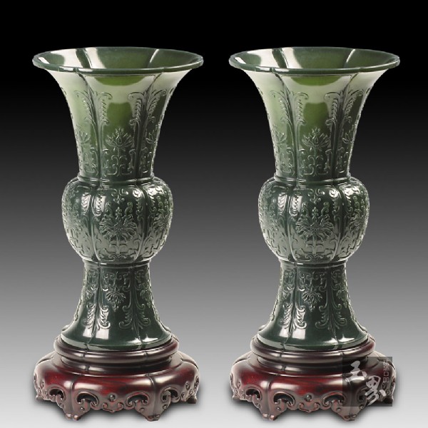 該作品玉質溫潤細膩、凝脂光潔,設計獨到、新穎別致,器型優美,輕薄通透,古樸典雅、端莊大氣。整器帶有濃郁的痕都斯坦風格,可稱得上集尊貴典雅與文化時尚于一體,彰顯了玉雕藝術的獨到魅力。 青玉-貢品五件套規格:燭臺:高37CM,中臺直徑18CM,底部直徑14CM,重量1440克。花觚:高26CM,直徑5.5CM,重量1008克。爐:高27CM,直徑26CM,重量2040克。