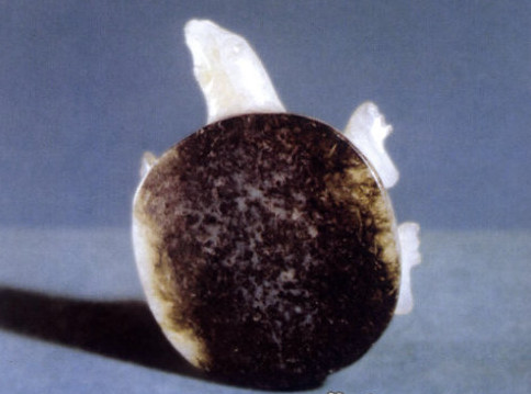 迄今為止,我國發現年代最早的俏色玉器是距今三千年前殷商時代、河南安陽出土的營玉鱉。營玉鱉巧妙地把握玉料的自然色澤和紋理特點,將原有的黑褐色皮保留下來琢成鱉的背甲,頭、腹、足均為青白色,黑色雙目和白爪上都留著黑色爪尖,神韻天成,妙趣橫生。