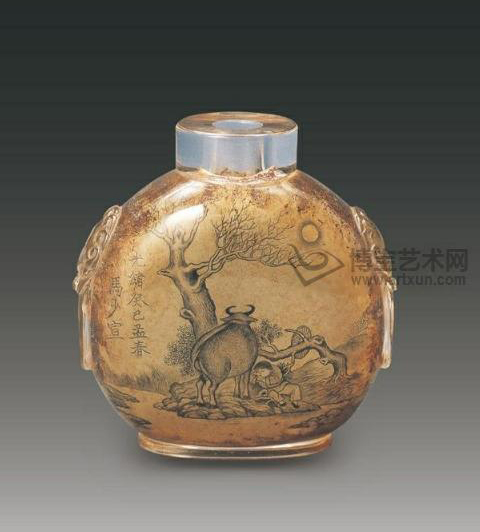 用水晶或茶晶作煙壺,彩畫在膛內,稱為內畫壺。內畫壺畫上山水人物花鳥草蟲、肖像,寫上真草隸篆、詩詞章句,玉筆寫意,亦不減大作之風。凡透明玉石作薄胎玉器都能在膛內施以內畫。內畫工藝使用的工具是勾形毛筆,筆伸入內膛,眼在外觀察落筆部位,勾畫畫面。因此,掌握內畫工藝一方面是用筆技巧,一方面是美術基礎,好的作品正是這兩方面結合完成的。