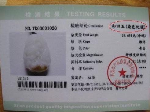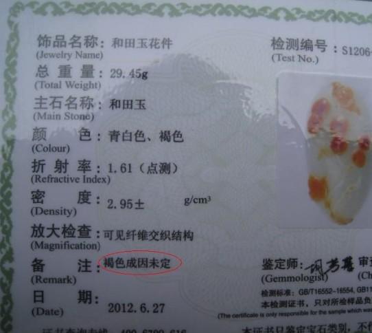 小結:和田玉檢驗證書上并非不能注明染色或皮色二上,但也不容易。