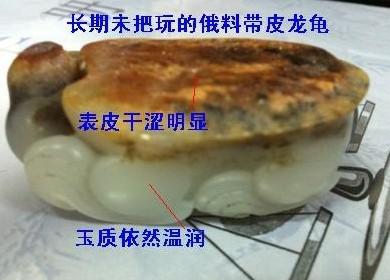 俄料本身不會,但皮很可能會。這里說的可能會“越盤越干、越盤越澀”的皮是那層“僵皮”(伴生石皮、風化皮、腐蝕層)。大家多已學會拭去玉件上“美容油”、“美容蠟”后再看好壞了,但俄料的這層“皮”性質和玉不同,其中SiO2、FeO含量低,而AlO,、MgO、K2O、Na2O含量高,油、蠟等能沁入較深,擦拭等簡單的方法難于立即除去,而隨著長期的盤玩,油、蠟揮發或升華掉了,也就“變干”了,其實這才是它的“本來模樣”。