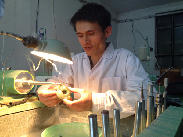 在呂天昌的玉雕廠內,記者看到,他和自己的徒弟們一樣穿著白大褂,認真的在雕琢手里的玉器。從部隊復員的他,依然保持著好習慣,操作臺上干凈利索,加工廠雖小,但是在他的管理下,玉雕加工廠顯得井井有條。呂天昌告訴記者,作為一名從部隊退伍的軍人,就要保持部隊的良好習慣。