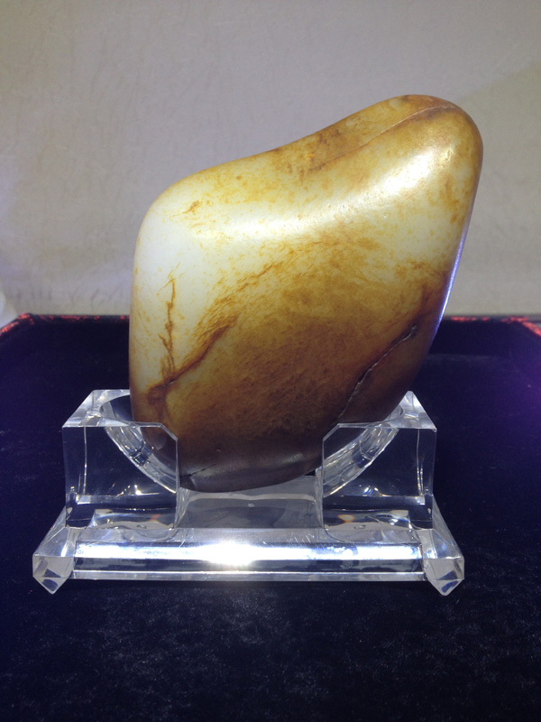 許祐瑋介紹,新疆和田籽料是和田山料,風化后,經流水帶至河中。經流水沖刷和玉石的碰撞,形成卵圓的形狀。因此,籽料在外形上和石頭有些相像。
