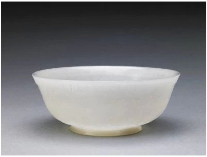 玉質碗在清代宮廷的使用非常廣泛,數量上可算得上是玉器之最。采用玉質主要是青玉、白玉,其次是碧玉、黃玉。造型多樣,如高足碗、平足碗、墩式碗、淺足碗、蓋碗、花瓣口碗和直口碗等。主要運用浮雕、陰刻、填金等技法,有的在表面飾紋,有的碗內外均雕琢紋飾,還有的刻有乾隆御制詩和款識。玉碗的加工技術水平在清代中期達到了頂峰。