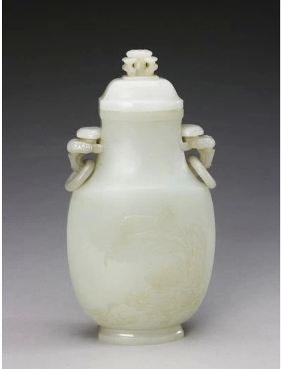 瓶為青玉質,帶蓋,蓋鈕鏤雕為靈芝狀。瓶肩裝飾靈芝式雙耳并套活環。瓶腹兩邊均以淺浮雕雕飾谷穗和鵪鶉。穗即“歲”,鵪鶉即“安”,和此瓶組合在一起即為歲歲平安之意。