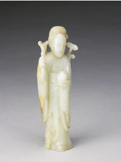 青玉,有皮色,光澤瑩潤。圓雕仙人立像。仙人左手捧桃,右手執靈芝,一枝負于肩頭,并盤繞于仙人肩頸。盤發,發絲以極細的陰刻線琢出。仙人長袍及地,衣飾線條勾勒清晰,衣袂翻飛,整體造型優雅,極富層次感和立體感。靈芝為仙草靈藥,寓意吉祥長壽。此件器物有仙人祝壽之寓意。