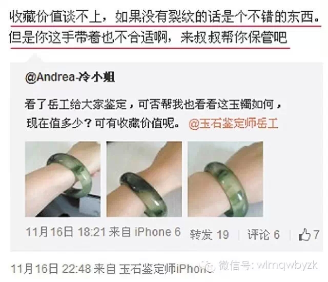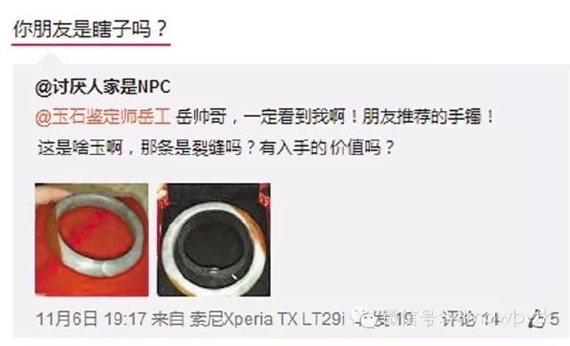 記者在瀏覽新浪微博時發現,在近期的“岳工鑒定”中并沒有涉及相關玉石鑒定專業知識,很多都是惡搞和肆意的評估。“冒充我的身份,做出的鑒定很不靠譜,說話的水平很差,以不負責任的娛樂性語言進行解答。還在博文中鏈接一些珠寶商鋪的網址,有經商謀利之嫌。這個‘李鬼’的行為不但有損我個人名譽,對人們認知玉石也有不良影響。”岳蘊輝對此非常憤懣。
