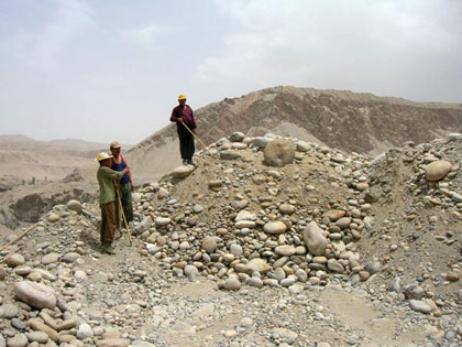 白玉河是產出羊脂玉和白玉籽料的流淌著財富的河,隨近年來對白玉需求的瘋狂增長,導致了當地掠奪性的開采.6月中,我來到河床,舉目遠望,在視野范圍內,全是被翻起的鵝卵石,按當地政府規定,現有河床200米范圍內不許挖掘,此外,可根據地段不同以每畝2000至5000元不等的代價承包挖掘.