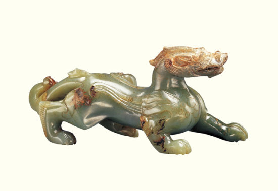 長(zhǎng)達(dá) 19.5 公分的漢代圓雕玉神獸,玉質(zhì)青翠、體態(tài)動(dòng)感,仿佛正在行進(jìn)之中,正是用多視點(diǎn)組合的手法刻畫的
