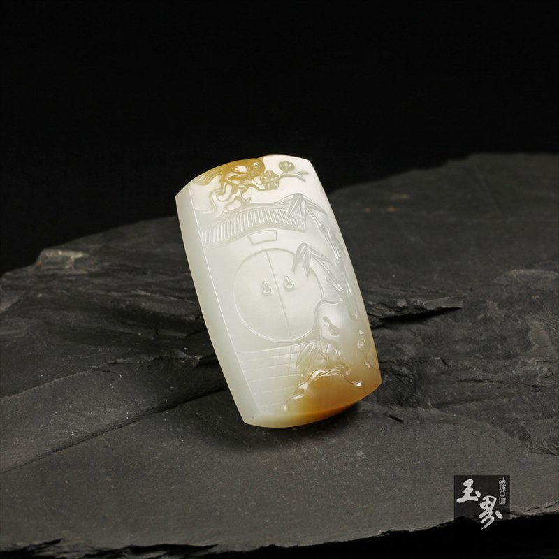 此件作品玉質油潤縝密,糖色清麗淡雅,予人溫雅柔美之感。作者巧用俏色精心設計,上有喜鵲登梅,下有奇石嶙峋,翠竹瀟瀟挺秀,花木掩映之間,戶樞緊閉,門內情景雖不得見,卻已令人浮想聯翩。