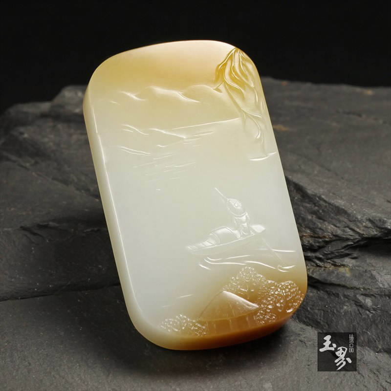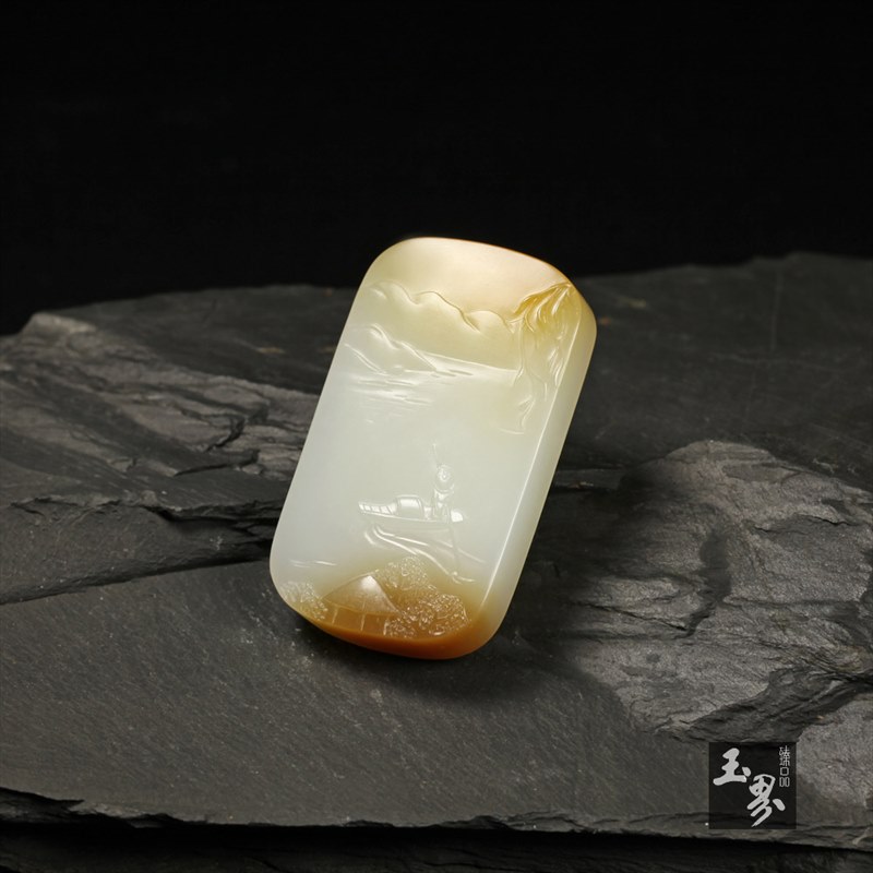 第二件作品,則是一塊糖白玉山水牌。一直覺得,和田青花玉非常適合用來表達黑山白水的壯美江河;相比之下,糖白玉則更適合展現婉約柔美的江南風光: