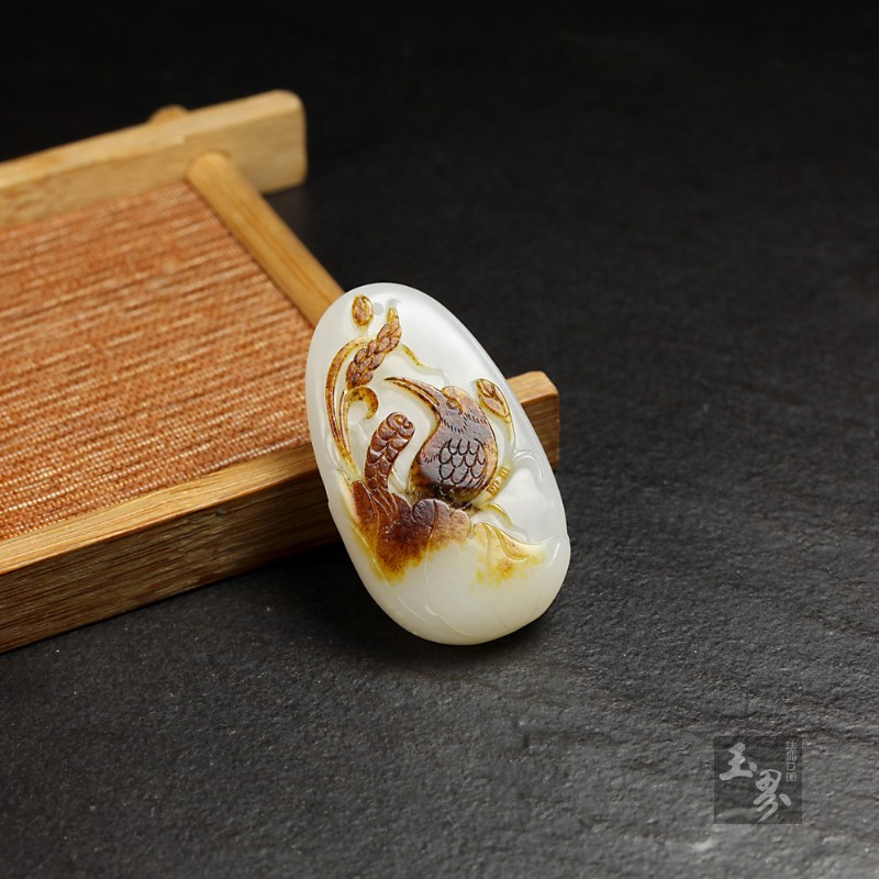 這是一塊圓潤白潔的個性籽玉,天然包裹著一層美麗的皮色,精致神靈的工藝由深漸淺的表現(xiàn)著美好愿望,豐富的層次點出一個富有意趣的主題,而整體構(gòu)架藝術(shù)的表達出文化內(nèi)涵,然后就是越玩越散發(fā)的絲絲溫暖,在掌上、在心中、在回味里……我想,我的作品跟自己的生活、經(jīng)歷、性格和愛好有關(guān),它可能是雞、魚、花,也可能是鳥,這就是我夢想的作品,那么生動,那么唯美,那么藝術(shù)。