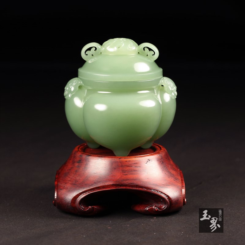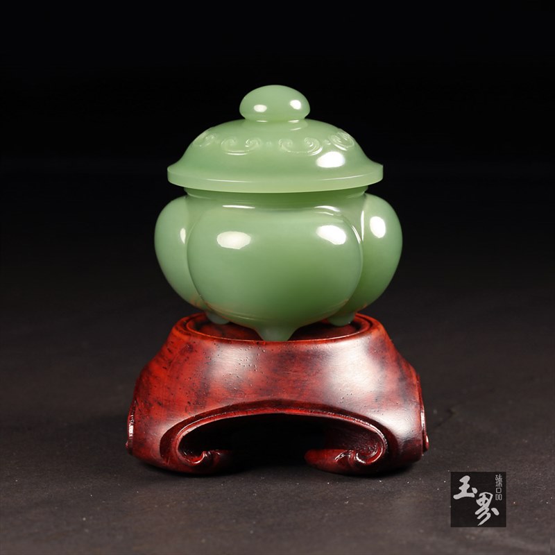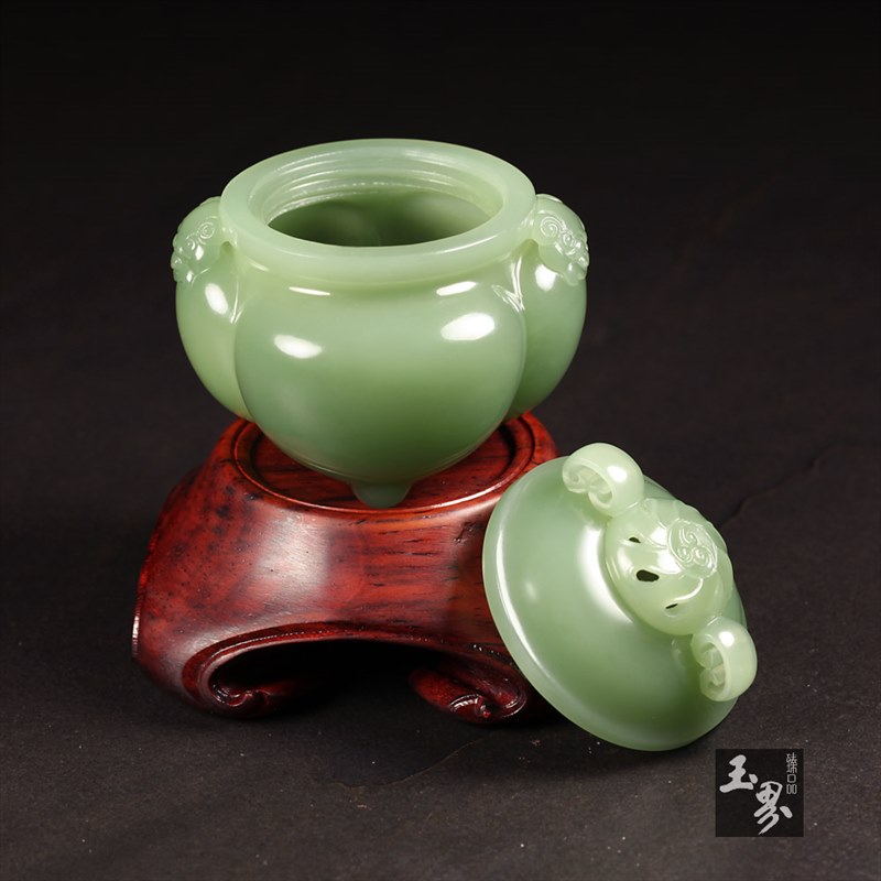 碧玉文玩香薰爐,玉質細膩,無瑕疵、綹裂。整器造型工整大氣,細節處理圓潤精巧,三足為底,富于藝術美感。爐蓋有如意狀鏤空,燃香于爐內,青煙裊裊,幽香隱隱,人心自靜,如在空山。