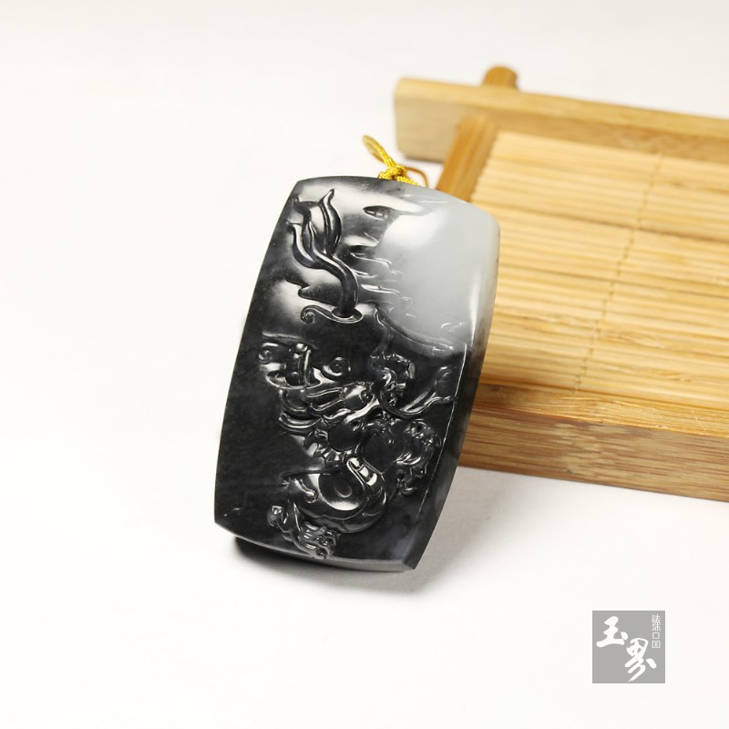 龍是中華民族的圖騰,傳說中它能隱能顯,春風時登天,秋風時潛淵,又能興云致雨、騰云駕霧。在中國,龍一直都是尊貴的代名詞。此作品玉質油膩細潤,黑白分明,雕神龍沖云破霧、直上九天攬月的情景,整器雕工精細,神韻生動又寓意進取。