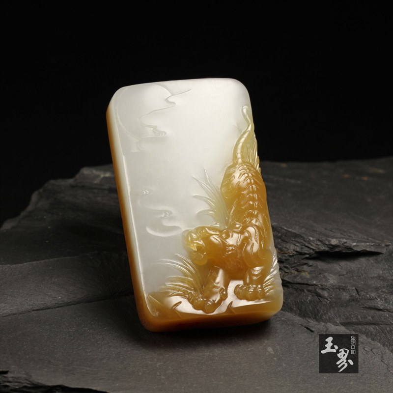 虎為百獸之君,是與龍并稱的一種圣獸。風從虎,云從龍,虎嘯生風,宏圖大展。此糖白玉俏色精致,糖色艷麗,猛虎形象栩栩如生,姿態敏捷而富于美感。身側蕭蕭風起,云水相生,不失精品之作。