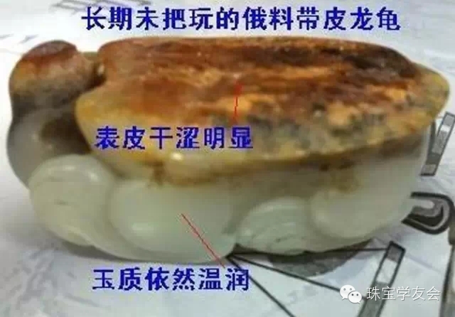 俄料本身不會,但皮很可能會。這里說的可能會“越盤越干、越盤越澀”的皮是那層“僵皮”(伴生石皮、風化皮、腐蝕層)。俄料的這層“皮”性質和玉不同,油、蠟等能沁入較深,通過擦拭等簡單的方法難以立即去除,而隨著長期的盤玩,油、蠟揮發或升華掉了,也就“變干”了,但并不是說玉料被盤干了。