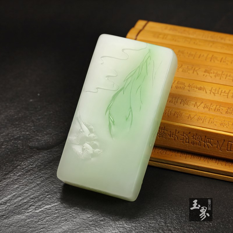 最后,來看背面詳圖,青綠柳條因風拂動,一雙春燕剪水而來,“春風春燕戲春柳”的圖景呼之欲出。整器留白運用巧妙,不經意間便留下了許多想象空間,設計者充分發揮了翠青玉這種特色和田玉的料質特點,使得整器展現出一種欲說還休的含蓄、古典韻味,細品之下,愈加回味悠長。