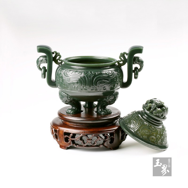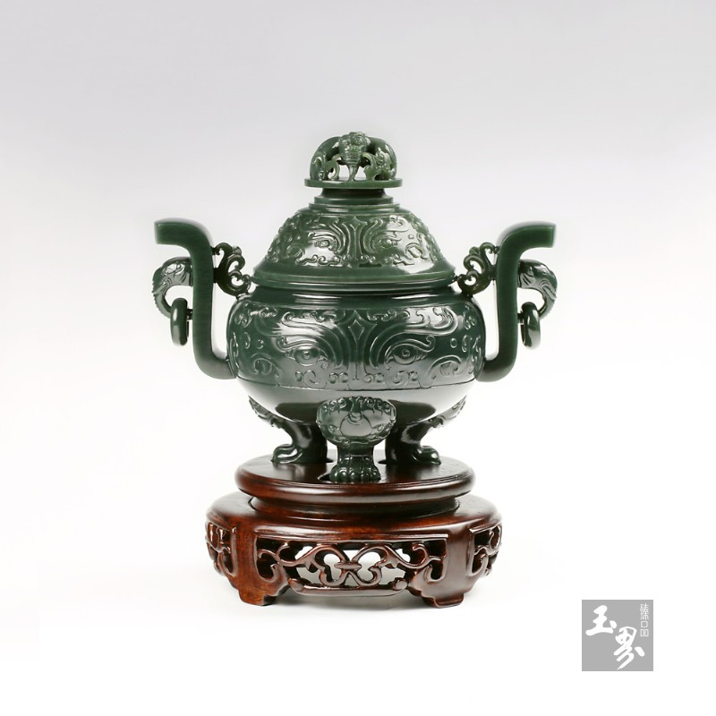 道教素有“天官賜福,地官赦罪,水官解厄”的說法,天官爐,因其雙耳弧度上翹形似天官官帽而得名。此作品以圓器型為主體,圓蓋、圓體、三圓足,浮雕獸面環(huán)繞球體表面,足部雕琢獸面、獸足,樸拙中見威嚴(yán)。整器雕工純熟,線條簡練,拋光圓潤,張馳有度,清新淡雅,凝重古樸,堪稱精品。