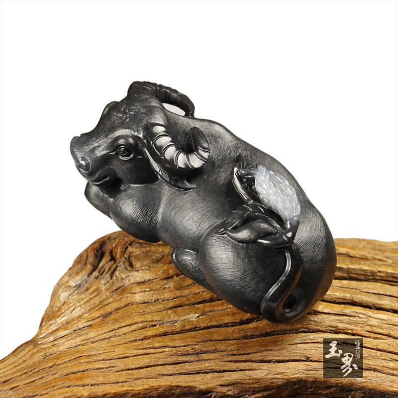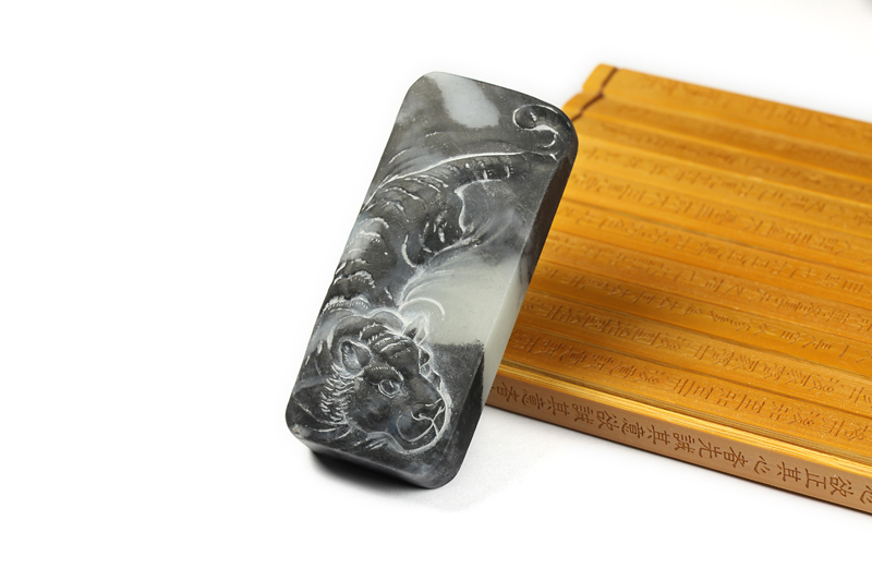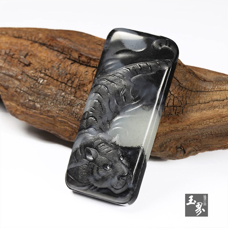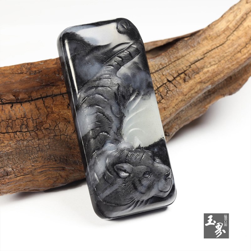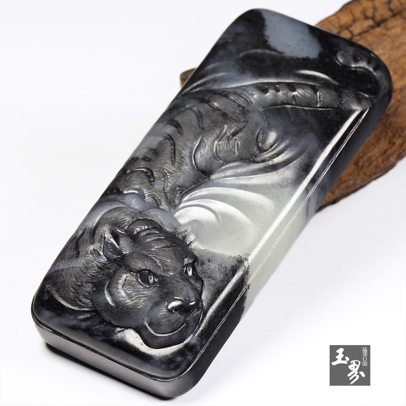 作品選用上好墨玉青花子料精心設(shè)計(jì)創(chuàng)作,正面雕黑虎涉水而行,虎口緊閉,不露獠牙,虎尾如鞭作舵,穩(wěn)健前行,神態(tài)謹(jǐn)嚴(yán)、若有所思,頗具王者之風(fēng)。虎身斑紋自然、黑白相雜,身下白水湯湯,襯得整器倍顯生動(dòng)而富于靈性。