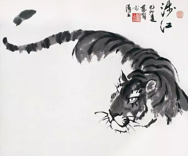 小編在賞看這件作品的時(shí)候,不止一次的腦洞大開,想著素有“山林之王”美譽(yù)的猛虎到底是為了什么要離開自己的地盤,孤身涉水而下呢?又為什么表情嚴(yán)肅??jī)叭灰桓睉n國(guó)憂民之態(tài)?難道是要去赴一場(chǎng)拯救天下蒼生的決戰(zhàn)?