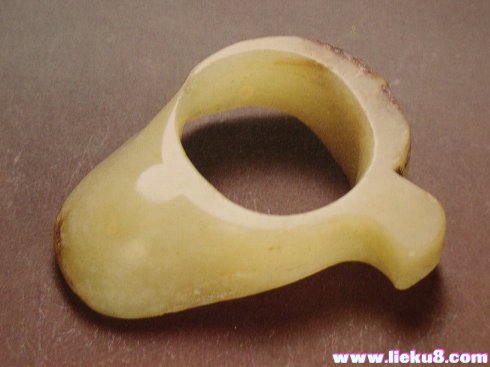 春秋戰國時期,玉韘的基本形狀為上端呈圓形,下端橫截面呈雞心形,其獸面紋、卷云紋作主要裝飾,與商代玉韘頗為相似。其區別在于:春秋戰國時期,玉韘 形制較矮,形狀猶如指環,后端中部有一尖狀凸起,一側端還有一傾斜向上的柄狀凸飾,但凸處飾有鳳頭形或獸面,不過已趨于抽象化。由此可看出,春秋戰國時期 的韘形器和商代有很大不同。
