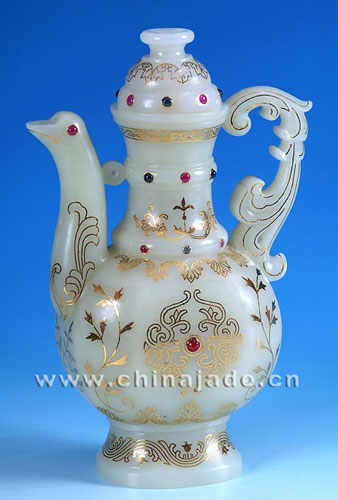 特別值得一提的是,馬進(jìn)貴在發(fā)掘和繼承痕都斯坦嵌寶金銀錯(cuò)工藝方面,可以說是嘔心瀝血,終于將失傳多年的這一加工工藝恢復(fù)生機(jī),并制作多件工藝品面市。他制作的白玉錯(cuò)金嵌寶石西番壺,具有鮮明的地方特色和民族風(fēng)格,將潔白的和田玉、艷麗的紅、藍(lán)寶石、黃燦燦的金絲與優(yōu)美的器形、流暢的紋飾有機(jī)地結(jié)合在一起,該作品端莊華貴、風(fēng)格獨(dú)特,他一問世就受到業(yè)內(nèi)同行的贊譽(yù)。2004年中國(guó)玉雕作品天工獎(jiǎng)評(píng)選中獲銀獎(jiǎng)。獲天工獎(jiǎng)和新疆玉雕精品獎(jiǎng)及最佳工藝獎(jiǎng)的還有“墨玉錯(cuò)銀龍鳳紋瓶”、“白玉薄胎錯(cuò)金嵌寶石瓜楞執(zhí)壺”,及“碧玉錯(cuò)銀嵌寶石碗”等。