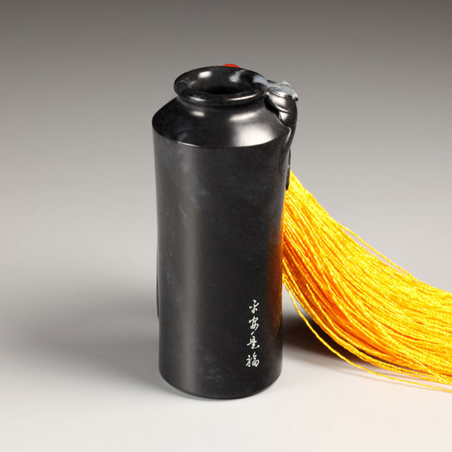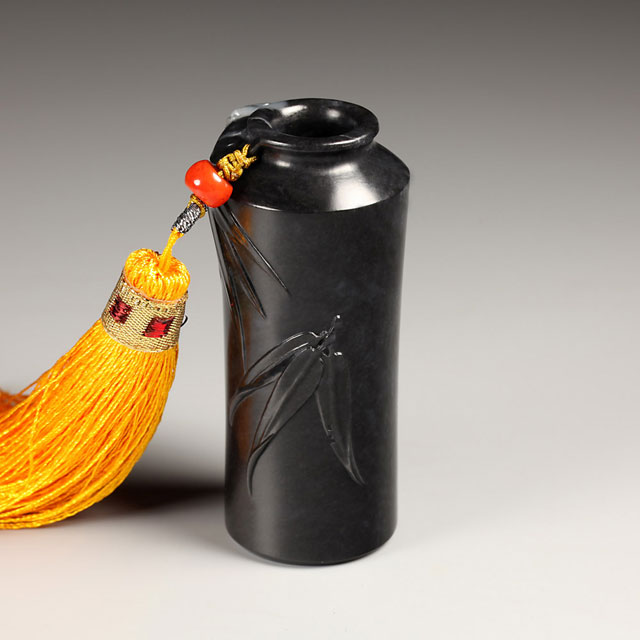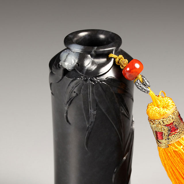 祝福把玩瓶,瓶身造型端莊古雅,俏色蝙蝠展翅,瓶身浮雕數叢竹葉,竹枝勁挺竹葉如劍,頗見竹之風骨。瓶下角鐫有“平安是福”四字。