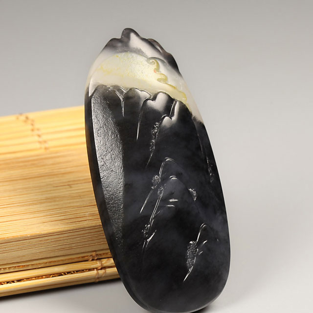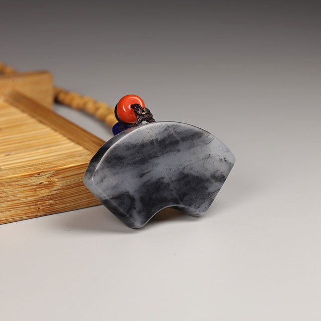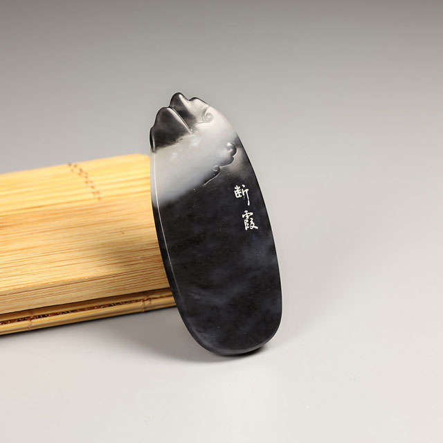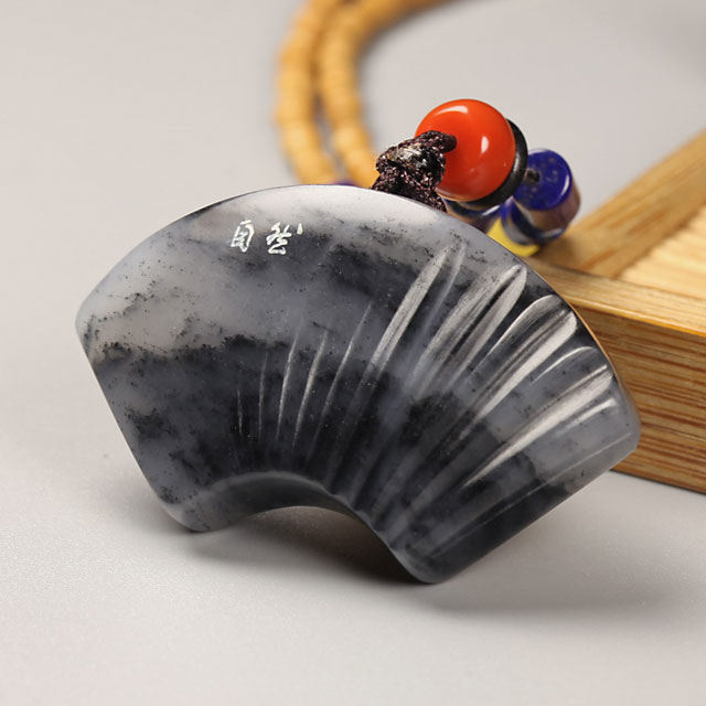 所謂自然即萬物生長,自然而發。此枚扇形牌造型精巧玲瓏,設計師稍加定型,略事雕琢折痕,襯以本身黑白玉色,倍顯云山霧罩之美,頗見自然之趣。