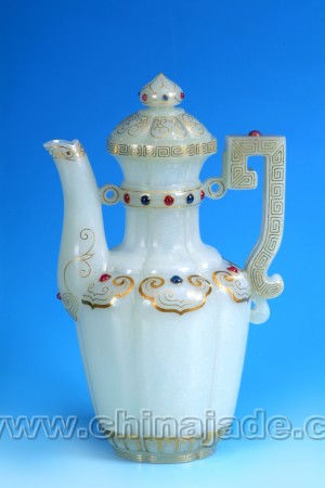 白玉薄胎錯金嵌寶石瓜棱執壺