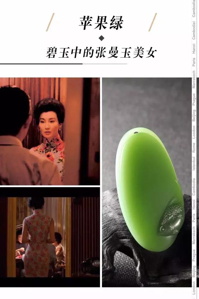 (五)蘋果綠(鴨蛋青系,行內也有稱粉綠)溫潤、渾厚適中,有著從內而外顯現的綠色,又是玉雕人所謂的嚴重的無結構,這種材料越看越美,越看越想看,這種美“無法形容”,她是種不傷眼的美。行內對于蘋果綠的說法不一,但確實很接近蘋果皮的綠色和質感,它出產稀少,有時就是個局部才出!在業內就多了些神秘感!大家都在說,能拿的出來的卻沒幾個!就像“花樣年華”里的張曼玉一樣,她的美麗極具東方的神秘氣質,她的美被定格在了《花樣年華》中那極具東方氣質的旗袍中了!這才是國際范!因為民族的才是世界的,她的創作也是要有中國文化的高級氣質才是!這種材質的綠是耐看的綠,這種綠更加的溫和。不知道大家有沒有這樣的體驗,一眼吸引注意的艷麗色彩,在較長的時間注視下,時間一長你就會感到視覺疲勞,眼前數量越多越明顯,寶玉石色彩更加明顯!就是視覺神經的刺激疲勞。而溫和的色彩,我們的視覺就會放松的多了!這也是我們中國哲學中對待生命的態度的表現,所謂“物極必反”。
