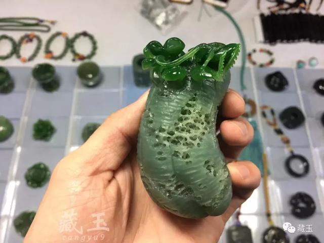 ▲這個(gè)碧玉成品很有意思,成品里有一些瑕疵,就雕成了這樣。跟蟲蛀的看起來一樣。